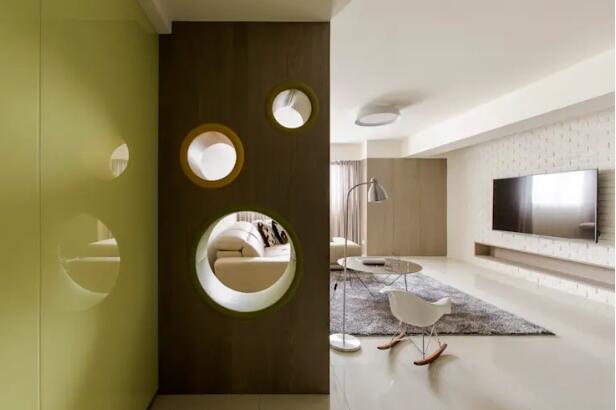 很多屋主不喜歡開(kāi)門(mén)的時(shí)候被鄰居看到屋內(nèi)的樣貌,因此在這個(gè)地方設(shè)置隔斷屏風(fēng)便能為家中增添隱私感。圖中的這個(gè)隔斷屏風(fēng)結(jié)合了木頭與塑膠的材質(zhì),不透明的設(shè)計(jì)讓家中保有絕佳隱密性。圖中的這個(gè)隔斷屏風(fēng)挖了三個(gè)不同大小的圓,巧妙分隔空間的同時(shí)卻又有穿透感。
